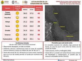 De acuerdo al reporte de las 13:00 horas de Protección Civil del Estado, Coatzacoalcos alcanzó una temperatura de 40.2 grados centígrados, sin embargo, su sensación térmica fue de 51 grados. De igual forma, en el norte, Poza Rica, registró una máxima de 39 grados, con sensación de 50, y Tuxpan 38 grados con sensación de 49.