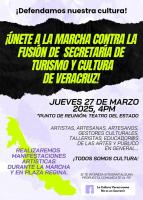 En redes sociales se ha lanzado la convocatoria para todos los creadores e integrantes de los grupos culturales locales para que este jueves 27 de marzo participen en la marcha en contra de la decisión gubernamental para fusionar a las secretarías de Turismo y a la de Cultura. Iniciará a las 16:00 horas afuera del Teatro del Estado para caminar por la avenida Manuel Ávila Camacho y terminar en la llamada Plaza Regina (Plaza Lerdo), enfrente del Palacio de Gobierno del Estado.