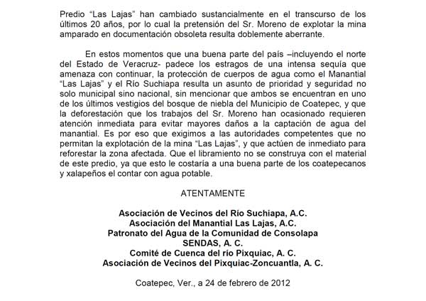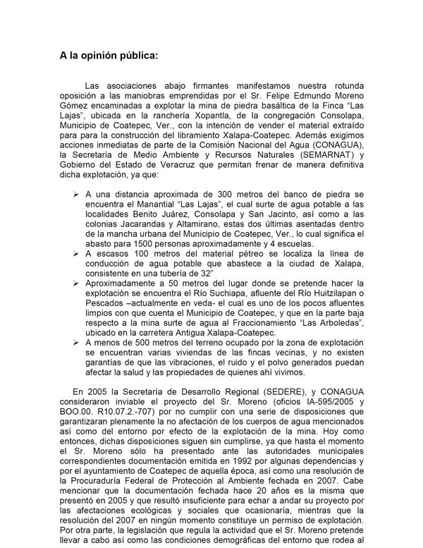 Las asociaciones: Asociación de Vecinos del Río Suchiapa A.C., Asociación del Manantial Las Lajas A.C., Patronato del Agua de la Comunidad de Consolapa, SENDAS A.C., Comité de Cuenca del Río Pixquiac, A.C. y Asociación de Vecinos del Pixquiac-Zoncuantla, A.C., le solicitamos se publique en su importante espacio periodístico en línea nuestra postura sobre las actividades encaminadas para la explotación de las mina de piedra basáltica de la Finca "Las Lajas", ubicada en la ranchería Xopantla, de la congregación Consolapa, Municipio Coatpec. En el archivo adjunto le enviamos la correspondiente carta a la opinión pública que requerimos sea publicada.