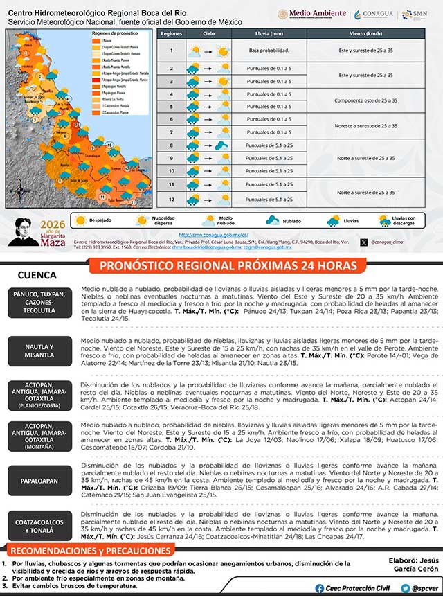 El frente frío número 37 se desplaza sobre el mar Caribe, dejando de afectar al país; sin embargo, la masa de aire ártico que lo impulsa cubre el noreste, este y sureste del territorio nacional, así como el Golfo de México, la cual durante esta jornada comenzará a modificar sus características térmicas, por lo que para Veracruz se espera: