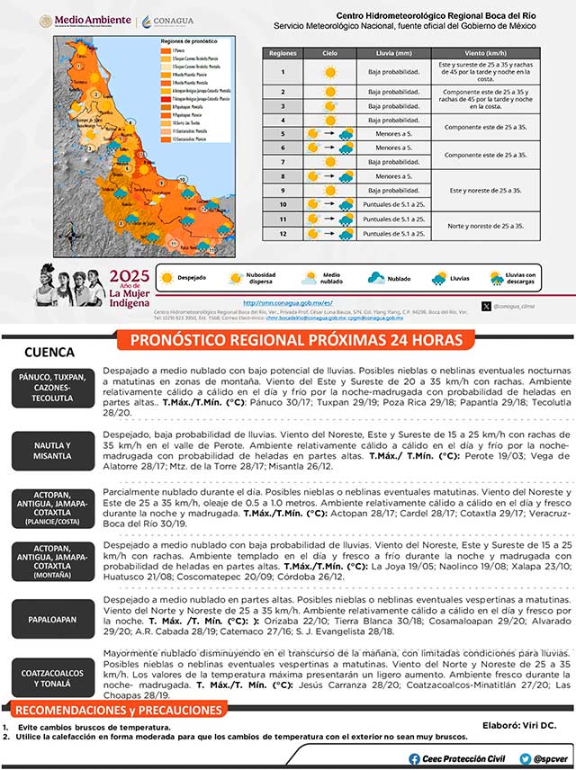Se prevé baja probabilidad de lluvias y tormentas en gran parte del estado de Veracruz, aunque no se descartan algunos eventos aislados sobre las cuencas del sur. Aumento gradual en la temperatura máxima. Persistiendo ambiente fresco a frío por la noche-madrugada con posibles heladas en partes altas.