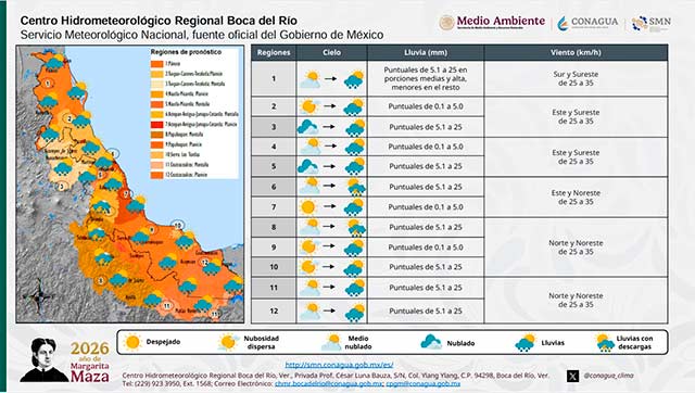 Se analiza dos vaguadas; la primera con eje del norte al centro de territorio nacional y una segunda al suroeste del Golfo de México, que estará favoreciendo cielo medio nublado a nublado, con probabilidad de lluvias ligeras a moderadas, principalmente en regiones de montañas y cuencas del norte. No se descartan tormentas. Nieblas y neblinas eventuales. Viento del Noreste, Este y Sureste de 20 a 35 km/h en costas. Oleaje de 1.0 a 2.0 metros. Se prevé el aumento gradual de la temperatura máxima, manteniendo un ambiente diurno cálido a relativamente cálido y fresco a frío por las noches-madrugadas. Probabilidad de heladas ligeras en partes altas.