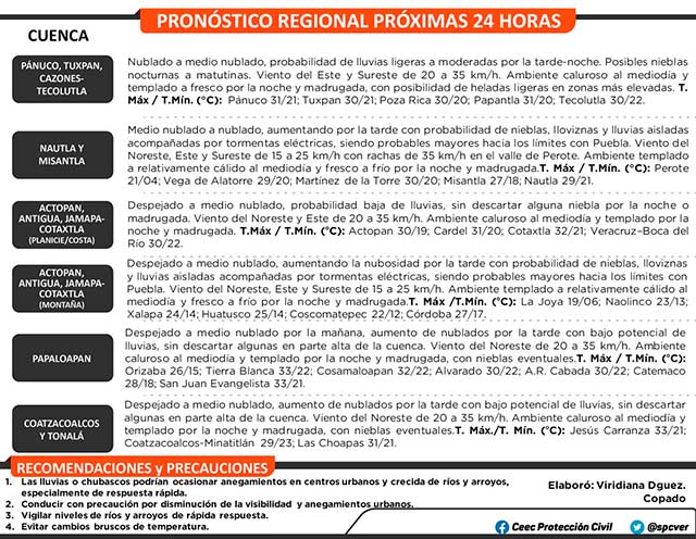 Se espera que la temperatura máxima aumente gradualmente, la probabilidad de lluvias y tormentas disminuya a partir de mañana lunes con los máximos acumulados en cuencas del norte y montañas. El viento continúe dominado del Sureste, Este y Noreste de 20 a 35 km/h en las costas. Consulte actualizaciones.