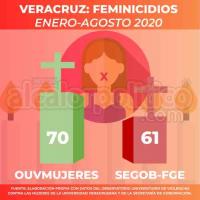 Datos enviados por la Fiscalía General del Estado de Veracruz (FGE) a la Secretaría de Gobernación (SEGOB), indican que de enero al mes de agosto se registraron en la entidad veracruzana 61 feminicidios. Sin embargo, en el mismo periodo el Observatorio Universitario de Violencia contra las Mujeres (OUVmujeres) de la Universidad Veracruzana (UV) identificó 70, esto es, 14.7 por ciento más.