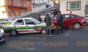 Daños materiales dejó esta mañana el choque entre un taxi y un auto particular en la avenida Miguel Alemán, a la altura de la calle Volcán de Colima, en la colonia Laderas del Macuiltépetl.