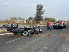 Se informó que un auto marca Audi color gris, circulaba sobre el carril que conduce a Veracruz y al pasar frente a la entrada al Club de Golf de Miradores del Mar, el conductor perdió el control del volante, impactó en la guarnición del camellón central, lo que lo hizo volcar y quedar llantas arriba en el carril contrario.