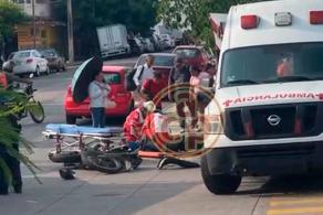 Tripulantes de una motocicleta, tuvieron un fuerte accidente la mañana de este domingo al ser arrollados por un camión urbano sobre la esquina de la avenida General Prim y la calle Manuel Doblado del centro de la ciudad, unidades de auxilio llegaron para atender a los involucrados.