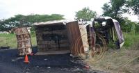 Al impacto el camión de volteo fue aventado varios metros fuera de la cinta asfáltica donde quedó volcado, mientras que el autobús resultó severamente dañado de la parte delantera y quedó atravesado sobre la carretera.