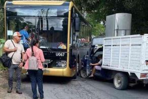 El percance ocurrió en un tramo angosto, donde el autobús intentaba avanzar y se encontró con la camioneta Nissan de redilas, color azul, lo que provocó el impacto. Solo se registraron daños materiales en ambos vehículos; no hubo personas heridas entre los pasajeros del transporte público ni en la unidad particular.