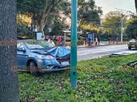 Automovilista pierde el control, se sube a camellón y choca con luminaria, en Xalapa