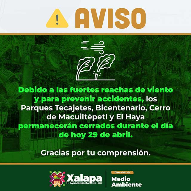Xalapa, Ver., 29 de abril de 2023.- El Ayuntamiento de Xalapa informa que debido a las fuertes rachas de viento y para prevenir accidentes, los Parques Tecajetes, Bicentenario, Cerro de Macuiltépetl y el Haya permanecerán cerrados este sábado.