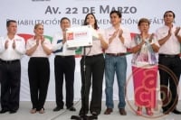 Realizando trabajos de fresado y repavimentación asfáltica, este lunes por la mañana, en compañía de Víctor Hugo Vázquez Bretón, presidente del Patronato del DIF Municipal, así como de los regidores y directores del Ayuntamiento, la Alcaldesa arrancó las labores en la Avenida 22 de Marzo.