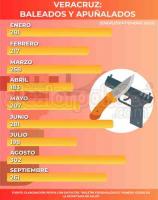Para dimensionar el comportamiento de estos hechos por los que resultaron heridas 2 mil 188 personas en los primeros 9 meses del año en el Estado de Veracruz, los reportes mensuales fueron los siguientes, aunque es pertinente precisar que la Secretaría de Salud no advierte cuántos fueron heridos por arma de fuego o por arma blanca: