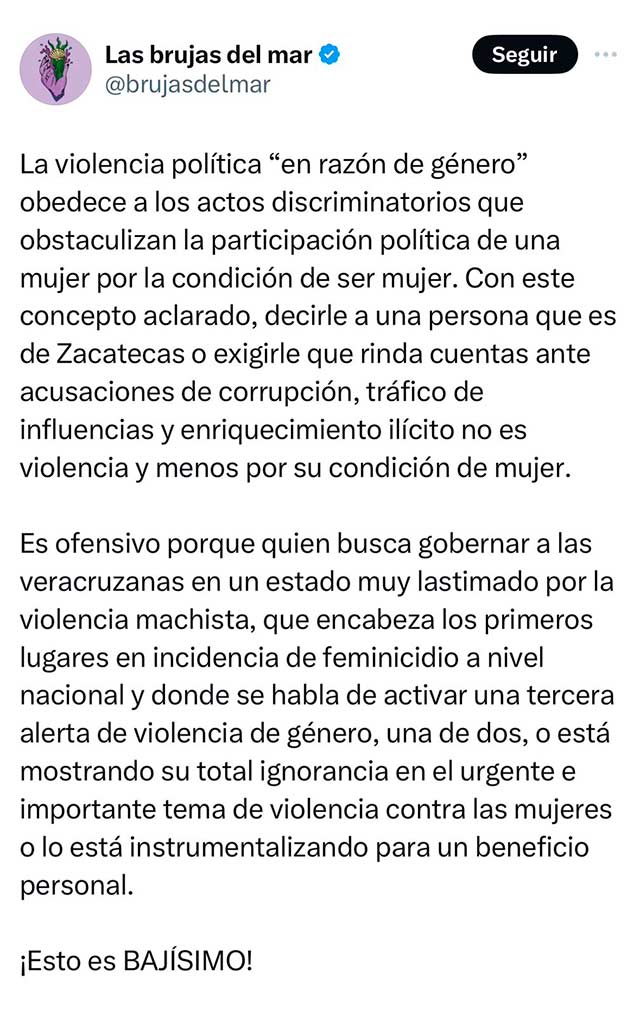 “Es ofensivo porque quien busca gobernar a las veracruzanas en un estado muy lastimado por la violencia machista, que encabeza los primeros lugares en incidencia de feminicidio a nivel nacional y donde se habla de activar una tercera alerta de violencia de género, una de 2: o está mostrando su total ignorancia en el urgente e importante tema de violencia contra las mujeres o lo está instrumentalizando para un beneficio personal”. Con la frase, “¡Esto es BAJÍSIMO!”, termina la publicación del colectivo.