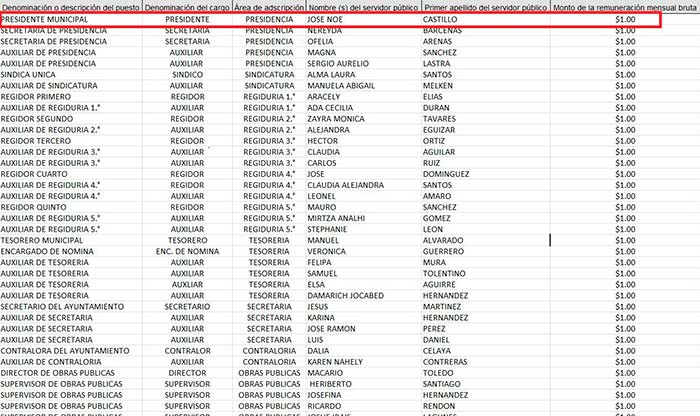 De acuerdo con la información disponible en el apartado de Transparencia del portal institucional oficial del Gobierno de Agua Dulce, correspondiente a la fracción VIII, relativa a la remuneración bruta y neta de todos los servidores públicos del primer trimestre del 2022, por lo menos 943 empleados de confianza y base ganan sólo un peso al mes.
