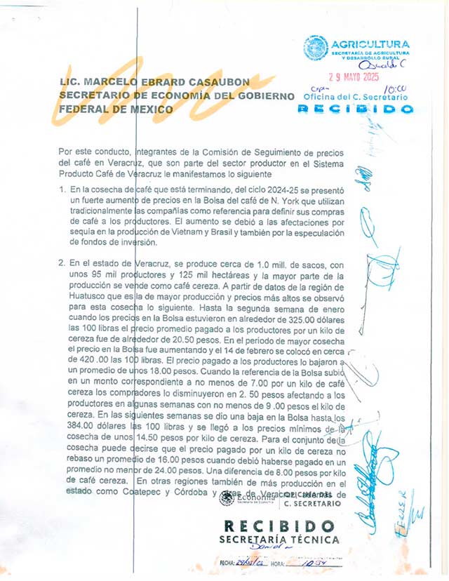 En un oficio enviado al funcionario federal, los integrantes de los Consejos Regionales del Café advirtieron que, aunque el precio internacional del grano se mantuvo alto en los primeros meses del año –entre 325 y 420 dólares por cada cien libras–, los productores locales apenas obtuvieron pagos de entre 7 y 18 pesos por kilo. Esto representa una brecha significativa frente a los 24 pesos por kilogramo que consideran justos.