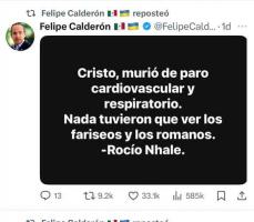 “Cristo murió de un paro cardiovascular y respiratorio. Nada tuvieron que ver los fariseos y los romanos, Rocío Nahle”, compartió el exmandatario panista, en una publicación que rápidamente se viralizó.