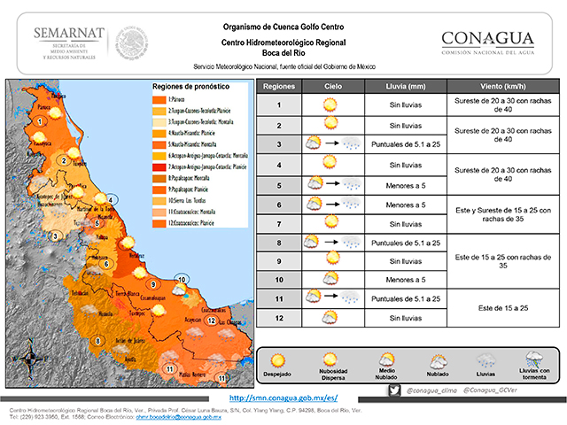 El Frente Frío 45 retorna como cálido hacia los EE.UU., producto del establecimiento del flujo del este-sureste en gran parte del Golfo de México, situación que favorecerá la gradual disminución de nublados, ambiente diurno cálido y limitado potencial de lluvias en gran parte del estado de Veracruz durante este sábado, excepto en regiones montañosas donde se prevé el aumento de nublados por la tarde con probables lluvias dispersas.