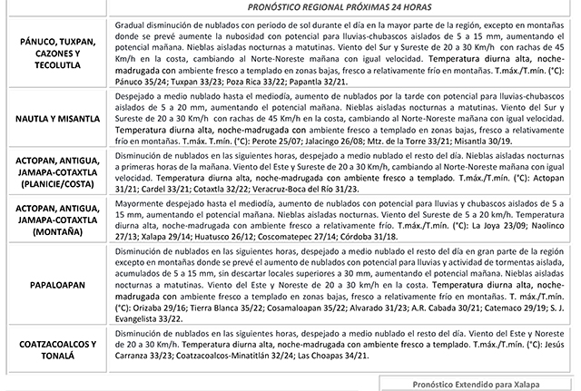 Modelos de pronóstico son persistentes en indicar el desarrollo de una vaguada en el Suroeste del Golfo de México y la llegada del Frente Frío 46 al noroeste del mismo Golfo durante el día de mañana, situación que ocasionará aumento de nublados y del potencial de lluvias en gran parte de Veracruz, estimando el mayor incremento en regiones montañosas donde se puede registrar actividad de tormenta, el viento se establecerá nuevamente del Norte con velocidades moderadas a frescas y ocasionando un ambiente menos cálido en la zona Norte y manteniéndose cálido en el resto de la entidad.