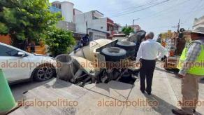 Una persona lesionada fue el saldo que dejó la caída de un camión revolvedora en un socavón de la avenida Hernández y Hernández y Azueta, en la ciudad de Veracruz, el conductor de la unidad resultó con golpes.