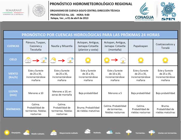 PRONÓSTICO: DE 9:00 HORAS DEL 01/ABR/2013 A 9:00 HORAS DEL 02/ABR/2013