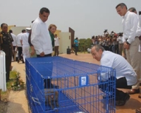 Calderón se acercó a la jaula en donde el felino permanecía inmóvil y cuando el mandatario se agachó para observarlo más a detalle el animal amagó con aventar un zarpazo y lanzó un pequeño rugido. La jaula se interpuso.