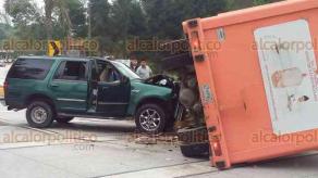 Dos lesionados y cuantiosos daños materiales dejó la tarde-noche de este miércoles un choque entre una camioneta y un camión repartidor de agua purificada que terminó volcado, en la carretera Xalapa-Coatepec, vía corta, a la altura de la calle Luis Donaldo Colosio, en la colonia Los Arenales.