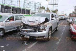 En la carretera federal Veracruz-Xalapa, cerca del destacamento de la Guardia Nacional, junto al distribuidor vial de Cabeza Olmeca, se presentó un accidente por alcance de una camioneta tipo Tahoe contra un carro de color rojo, dejando cuantiosos daños materiales.