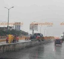 El conductor de una camioneta Ford color negro perdió la visibilidad cuando caía un fuerte aguacero, lo que ocasionó que la unidad quedara trepada sobre el muro de protección del puente Trancas. No se reportan personas lesionadas.