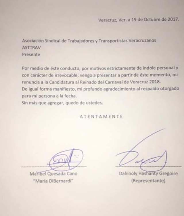 Fue el sindicato de Trabajadores y Transportistas Veracruzanos (ASTTAV) quien hizo llegar el ofició al presidente Luis Antonio Pérez Fraga, donde se anuncia la salida de "María Bernardi" como aspirante al reinado en 2018.