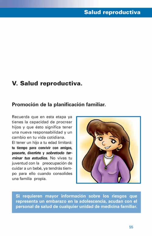 De este apartado continúan los aspectos que han causado algún tipo de polémica sobre salud reproductiva. Uscanga señala en la cartilla las leyendas: “Planificar la familia es tu derecho, solicita información”, “Si tuviste una relación sexual no protegida y no han transcurrido más de 72 horas, puedes solicitar anticoncepción de emergencia. Protégete, es tu derecho”, “Usa condón en cada relación sexual, es gratuito en todas las instituciones del sector salud. Protégete contra el SIDA y otras enfermedades de transmisión sexual”.