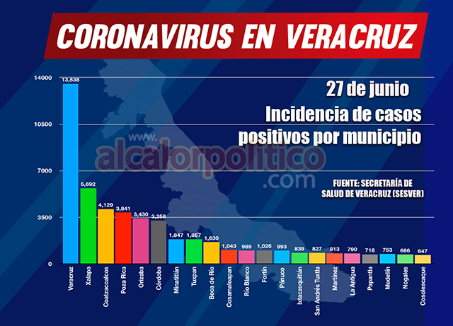 El municipio de Veracruz acumula 13,358 enfermos; le sigue el de Xalapa con 5,692; Orizaba 3,430; Córdoba 3,258; Boca del Río 1,630; Fortín 1,026; Río Blanco 989; Ixtaczoquitlán 839; La Antigua 790; Medellín 753; Nogales 686; Coatepec 570; Camerino Z. Mendoza 507; Alvarado 450; Mariano Escobedo 409; Perote 385; Emiliano Zapata 389; Úrsulo Galván 372; Ixhuatlancillo 263; Amatlán de los Reyes 233; Puente Nacional 230; Paso de Ovejas 214; Zongolica 212; Banderilla 189; Rafael Delgado, 182; Misantla 181; Actopan 153; Tlapacoyan 142; Atzacan 130; Huatusco 126; Coscomatepec 122; Manlio Fabio Altamirano 121; Altotonga 116; Soledad de Doblado 112; Tlalixcoyan 109; Xico 107; Huiloapan 106.