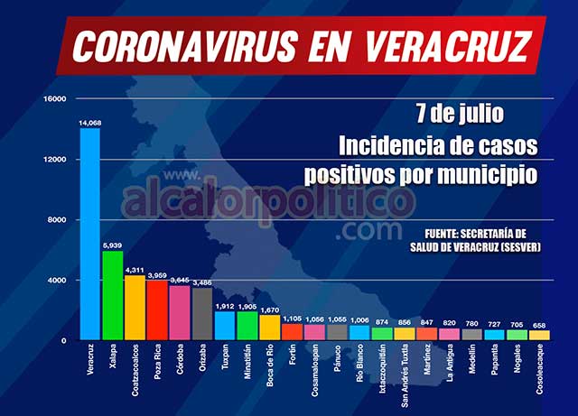 El municipio de Coatzacoalcos suma 4,311 casos; Minatitlán 1,905; Cosamaloapan 1,056; San Andrés Tuxtla 856; Cosoleacaque 658; Tierra Blanca 489; Nanchital 329; Tres Valles 300; Agua Dulce 272; Las Choapas 263; Acayucan 256; Jáltipan, 231; Lerdo de Tejada 227; Carlos A. Carrillo 225; Angel R. Cabada 176; José Azueta 143; Isla y Santiago Tuxtla 141 y Catemaco 125.