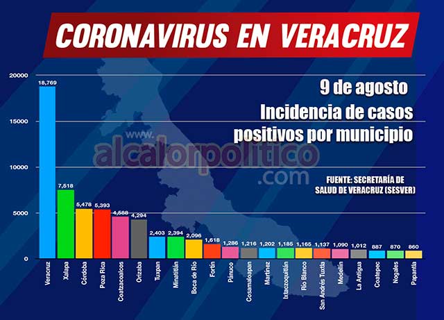 El municipio de Coatzacoalcos suma 5,393 casos; Minatitlán 2,394; Cosamaloapan 1,286; San Andrés Tuxtla 1,137; Tierra Blanca 708; Cosoleacaque 708; Tres Valles 424; Nanchital 370; Acayucan 321; Las Choapas 315; Lerdo de Tejada 310; Agua Dulce 307; Carlos A. Carrillo 255; Jáltipan, 245; Isla 231; Santiago Tuxtla 202; Ángel R. Cabada 219; José Azueta 174 y Catemaco 181.