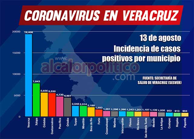 El municipio de Coatzacoalcos suma 5,530 casos; Minatitlán 2,514; Cosamaloapan 1,351; San Andrés Tuxtla 1,197; Tierra Blanca 742; Cosoleacaque 722; Tres Valles 486; Nanchital 374; Lerdo de Tejada 340; Acayucan 331; Las Choapas 328; Agua Dulce 313; Carlos A. Carrillo 263; Jáltipan, 250; Isla 245; Ángel R. Cabada 233; Santiago Tuxtla 223; José Azueta 191 y Catemaco 196.