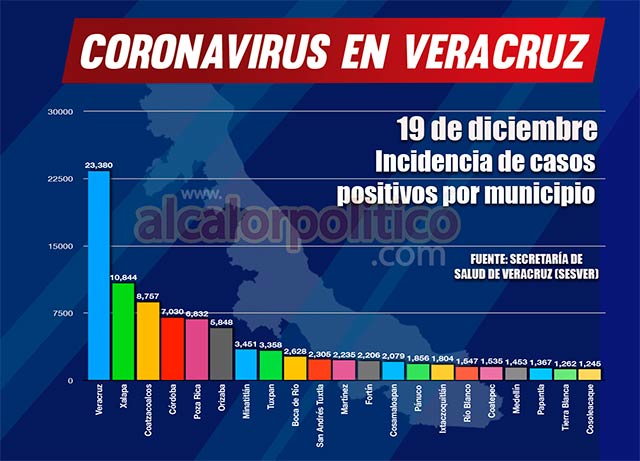 El municipio de Coatzacoalcos suma 8,757 casos; Minatitlán 3,451; San Andrés Tuxtla 2,305; Cosamaloapan 2,079; Tierra Blanca 1,262; Cosoleacaque 1,245; Tres Valles 728; Jáltipan 587; Lerdo de Tejada 532; Las Choapas 505; Acayucan 486; Catemaco 458; Nanchital 429; Agua Dulce 427; Ángel R. Cabada 353; Santiago Tuxtla 343; Isla 315; José Azueta 303; Hueyapan de Ocampo 288; Playa Vicente 132; Ixhuatlán del Sureste 115; Juan Rodríguez Clara 113.