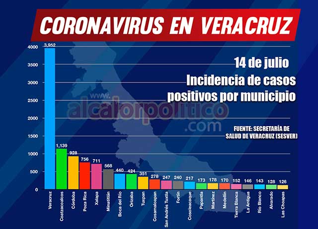 Veracruz, en color caoba, con 3 mil 952 casos positivos; en marrón: Córdoba, con 928 y Xalapa, con 711; en granate: Boca del Río, 440; Orizaba, 424 y Fortín, con 240; en color ladrillo: Medellín, 170; La Antigua, 146; Río Blanco, 143; Alvarado, 128; Ixtaczoquitlán, 118; Perote, 98; Nogales, 77; Coatepec, 76; Amatlán de los Reyes, 68; Emiliano Zapata y Mariano Escobedo, 61 cada uno; Camerino Z. Mendoza, 55; Úrsulo Galván, 52; en rojo intenso: Manlio Fabio Altamirano, Puente Nacional y Paso de Ovejas 38 cada uno; Soledad de Doblado y Zongolica, con 31 cada uno; Tlalixcoyan, 30; Actopan, 27 ; Ixhuatlancillo y Xico, 27 cada uno; Atoyac, 25; Tezonapa, 23 y ahora Rafael Delgado, con 22 y Banderilla, 21.