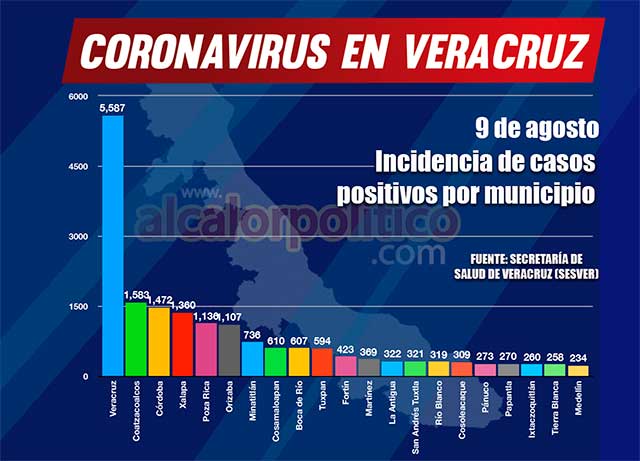 Veracruz, con 5 mil 587; Córdoba, mil 472; Xalapa, mil 360; Orizaba, mil 107; Boca Del Río, 607; Fortín, 423 y La Antigua, 322; Río Blanco, 319; Ixtaczoquitlán, 260; Medellín, 234; Nogales, 223; Alvarado, 199; Perote, 168; Coatepec, 155; Mariano Escobedo, 149; Camerino Z. Mendoza, 146; Úrsulo Galván, 113; Amatlán de los Reyes, 101; Emiliano Zapata, 99; Ixhuatlancillo, 86; Puente Nacional, 79; Paso de Ovejas, 58; Manlio Fabio Altamirano, 55; Rafael Delgado, 54 y Soledad de Doblado, 51.