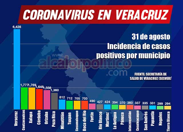 El municipio de Veracruz reporta 6 mil 428 casos positivos; Xalapa en incremento, suma 1,769; Córdoba 1,646; Orizaba 1,558 y Boca del Río 703; Fortín con 490; Río Blanco 427; La Antigua 394; Ixtaczoquitlán 360; Nogales 299; Medellín 285; Alvarado 224; Mariano Escobedo 198; Perote 193; y Camerino Z. Mendoza 187; Coatepec 187; Úrsulo Galván 169; Emiliano Zapata 134; Amatlán de los Reyes 113; Ixhuatlancillo 107; Puente Nacional 99; Rafael Delgado 75; Zongolica 73; Paso de Ovejas 72; Banderilla 61; Manlio Fabio Altamirano 61; Actopan 58; Soledad de Doblado 55; Huiloapan de Cuauhtémoc 52; Tlalixcoyan 52; y Coscomatepec 51.