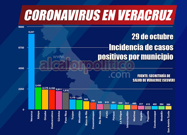 En la zona centro es en donde se observa mayor dispersión de la enfermedad. Allí, el municipio de Veracruz registra ya 8,227 casos positivos; Xalapa, 2,420; Orizaba, 2,179; Córdoba, 2,011; Boca del Río, 925; Río Blanco, 626 y Fortín, 610.