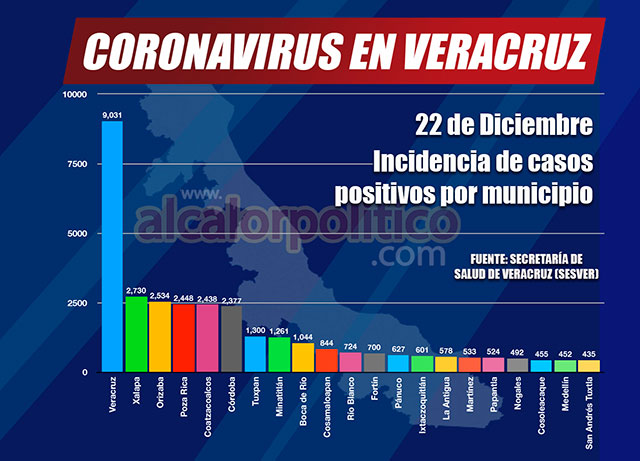 El puerto de Veracruz cuenta con 9,031 casos; Xalapa, 2,730; Orizaba, 2,534; Córdoba, 2,377; Boca del Río, 1,044; Río Blanco, 724; Fortín, 700; Ixtaczoquitlán, 601; La Antigua, 578; Nogales, 492; Medellín, 452; Alvarado, 331; Camerino Z. Mendoza, 326; Mariano Escobedo, 307; Coatepec, 298; Úrsulo Galván, 261; Perote, 252; Emiliano Zapata, 214; Ixhuatlancillo, 192; Amatlán de los Reyes, 170; Zongolica, 165 y Puente Nacional, 158.