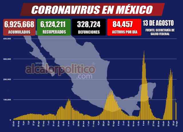 En las últimas 24 horas, la Secretaría de Salud federal informó de 9 mil 914 nuevos casos de COVID-19 y 56 defunciones a causa del virus; acumulando 84 mil 457 casos activos en el país.