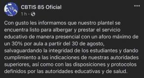 En la anterior publicación, el CBTIS 85 aseguraba que se evaluó la situación de contagio y por ello se determinó que no hubiera un regreso a las aulas como se tenía planeado por autoridades educativas.