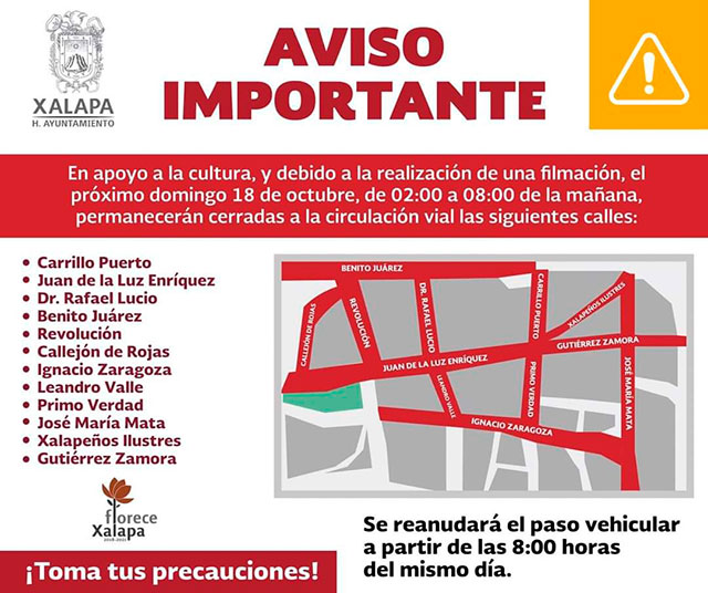 Xalapa, Ver., 17 de octubre de 2020.- El Ayuntamiento anunció en sus redes sociales que por grabación de escenas para un filme se cerrarán varias calles de la zona centro en las primeras horas del domingo y se reanudará la circulación a partir de las 8 de la mañana.