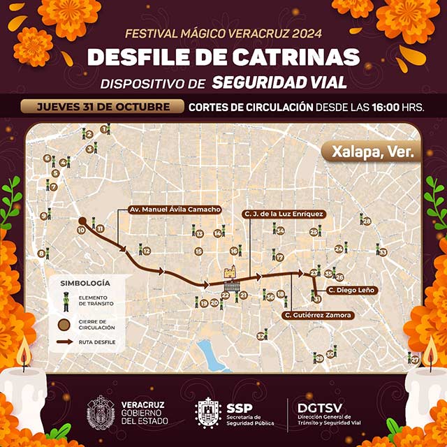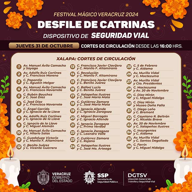 Tránsito y Seguridad Vial detalla los cortes a la circulación en calles del Centro de Xalapa a partir de las 16:00 horas de este jueves debido al Desfile de Catrinas.