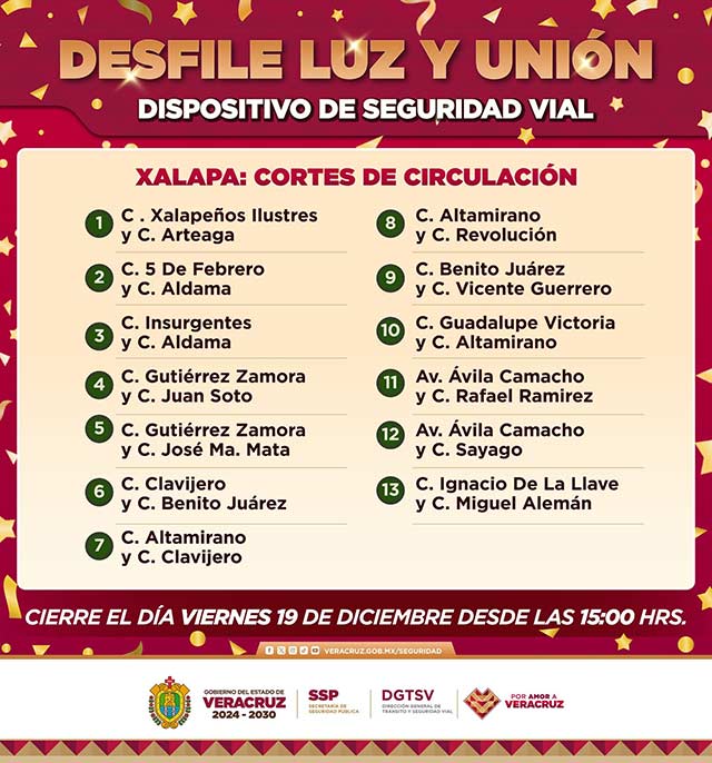 Xalapa, Ver., 18 de diciembre de 2025.- La SSP pidió programarse y anticipar recorridos debido al desfile "Luz y Unión". Calles del Centro serán cerradas a partir de las 15:00 horas de este viernes.
