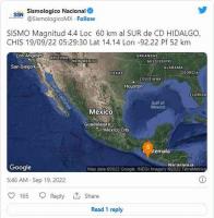 Este lunes 19 de septiembre se registró un sismo de 4.4 grados de magnitud con epicentro en Ciudad Hidalgo, en Chiapas.