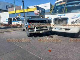 Un autobús del Servicio Urbano de Xalapa y una camioneta chocaron esta mañana de sábado en la avenida Lázaro Cárdenas, a la altura del puente “Heberto Castillo”, lo que dejó como saldo una pasajera lesionada y daños materiales.