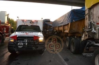 Esta persona iba a gran velocidad y a la altura del entronque del kilómetro 13.5 no disminuyó la velocidad y terminó impactado, por alcance contra el remolque tipo Tolva, color amarillo, con placas 992VM2 del SPF, que remolcaba un trailer, propiedad de la empresa Transportes Lujab SA de CV, el cual antecedía al trailer azul.