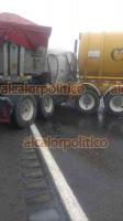 Después de la colisión por alcance, un tercer tractocamión no alcanzó a frenar y colisionó con el contenedor tipo góndola, quedando las tres unidades afectadas y en espera del servicio de arrastre de las grúas.